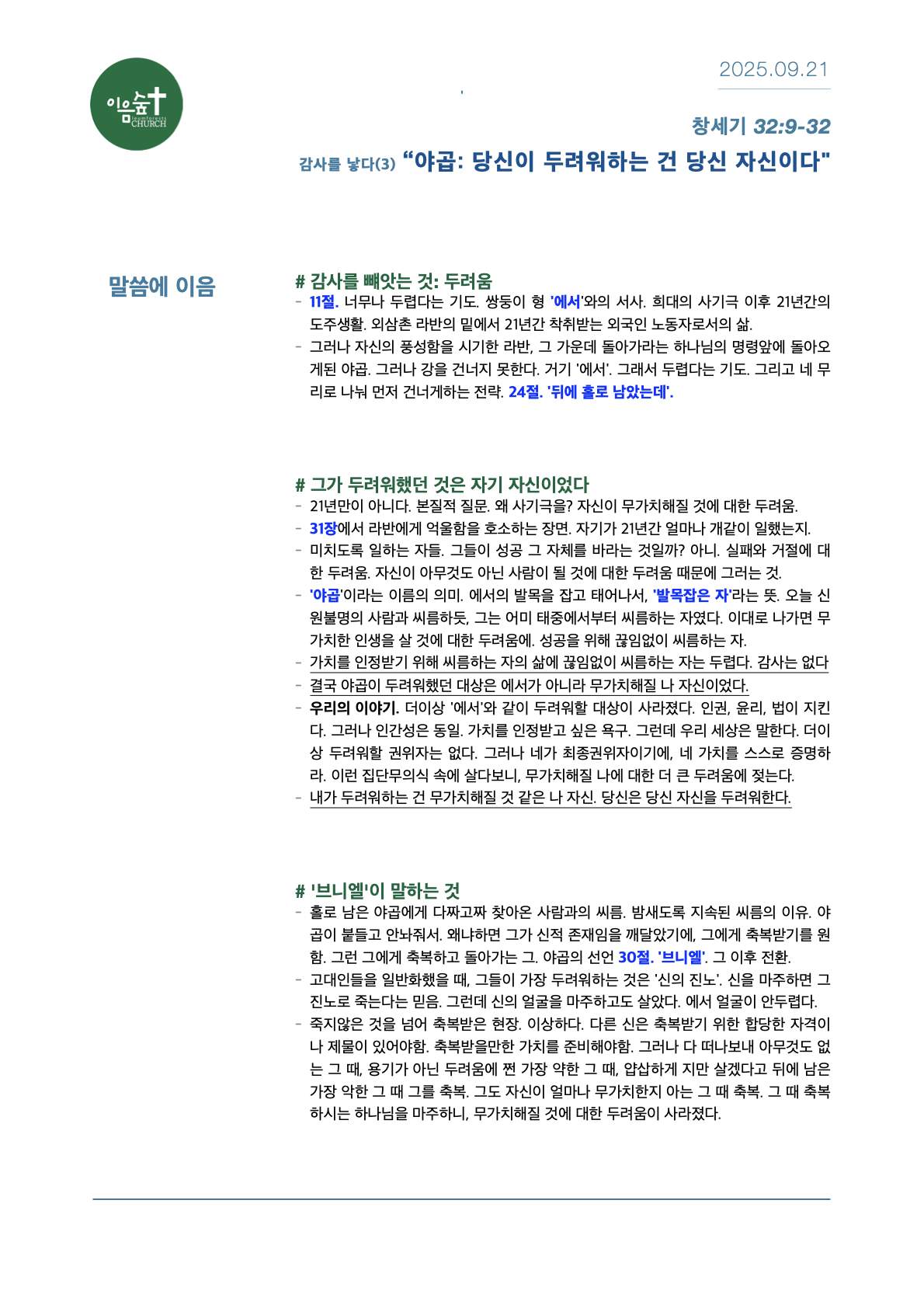 25.9.21 “야곱: 당신이 두려워하는 건 당신 자신이다” [창세기 32장]