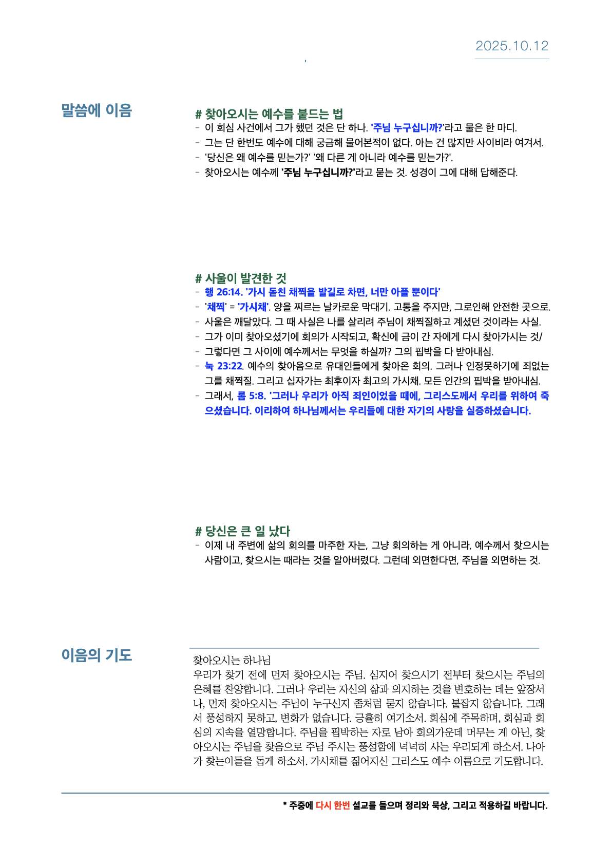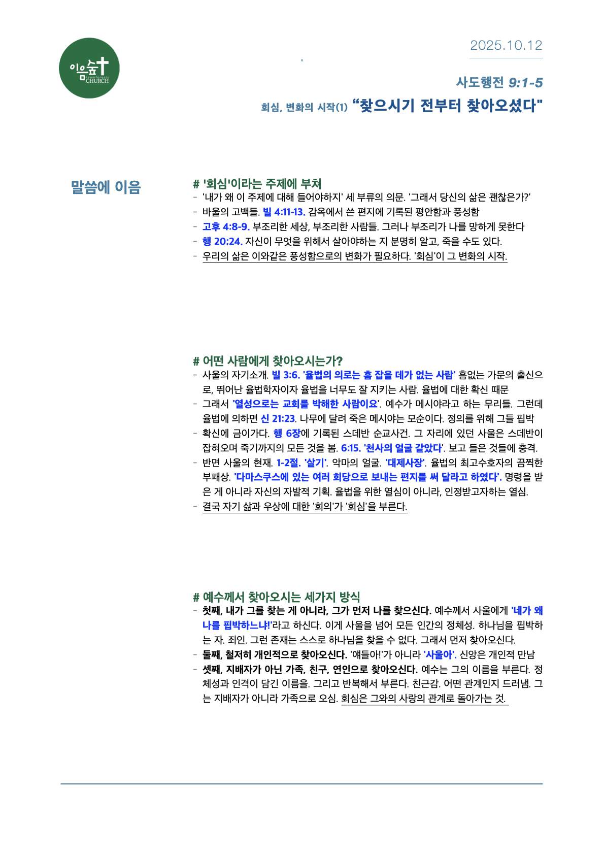 25.10.19 “참된 회개는 반드시 변화로 이어진다” [사도행전 9장]