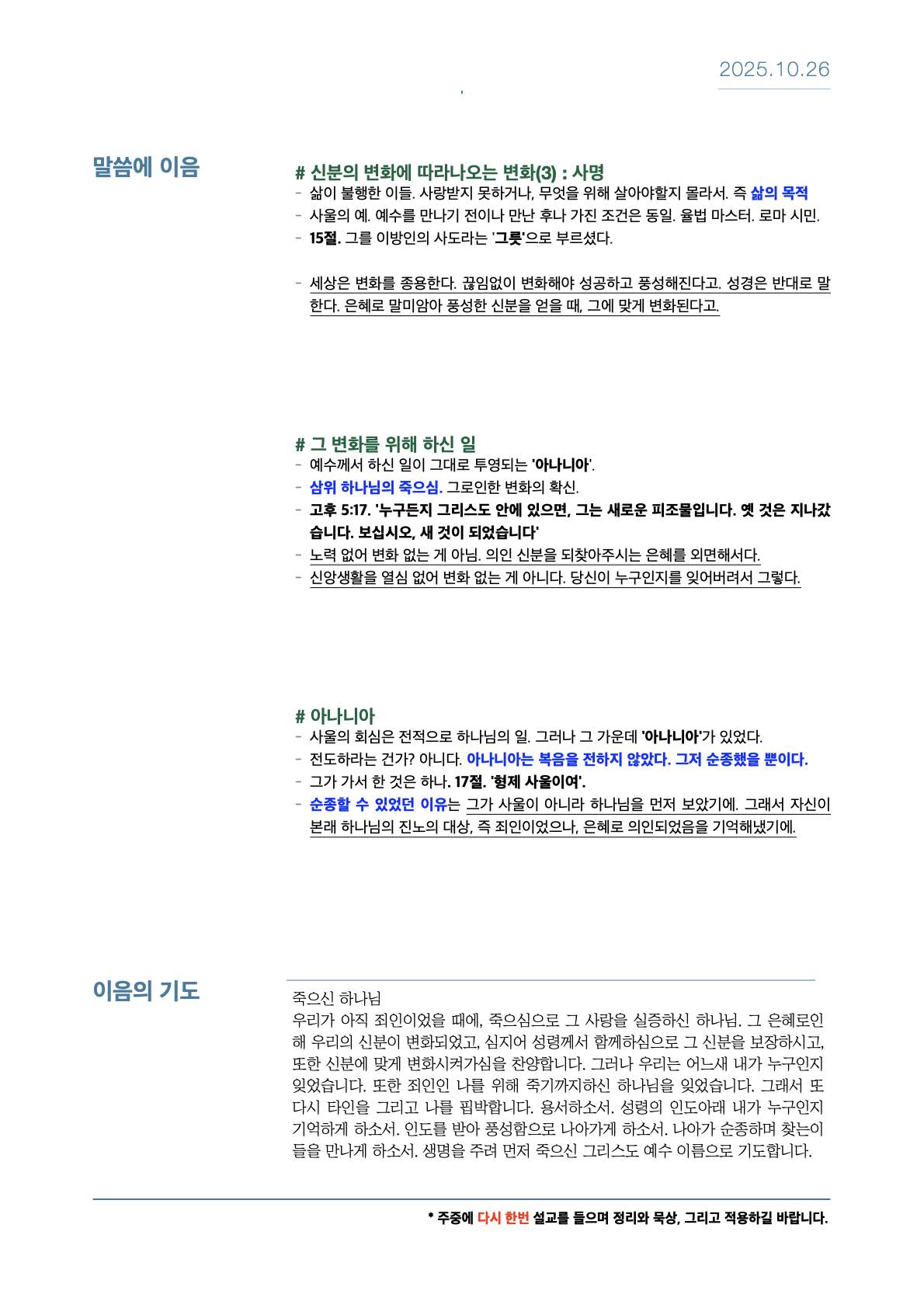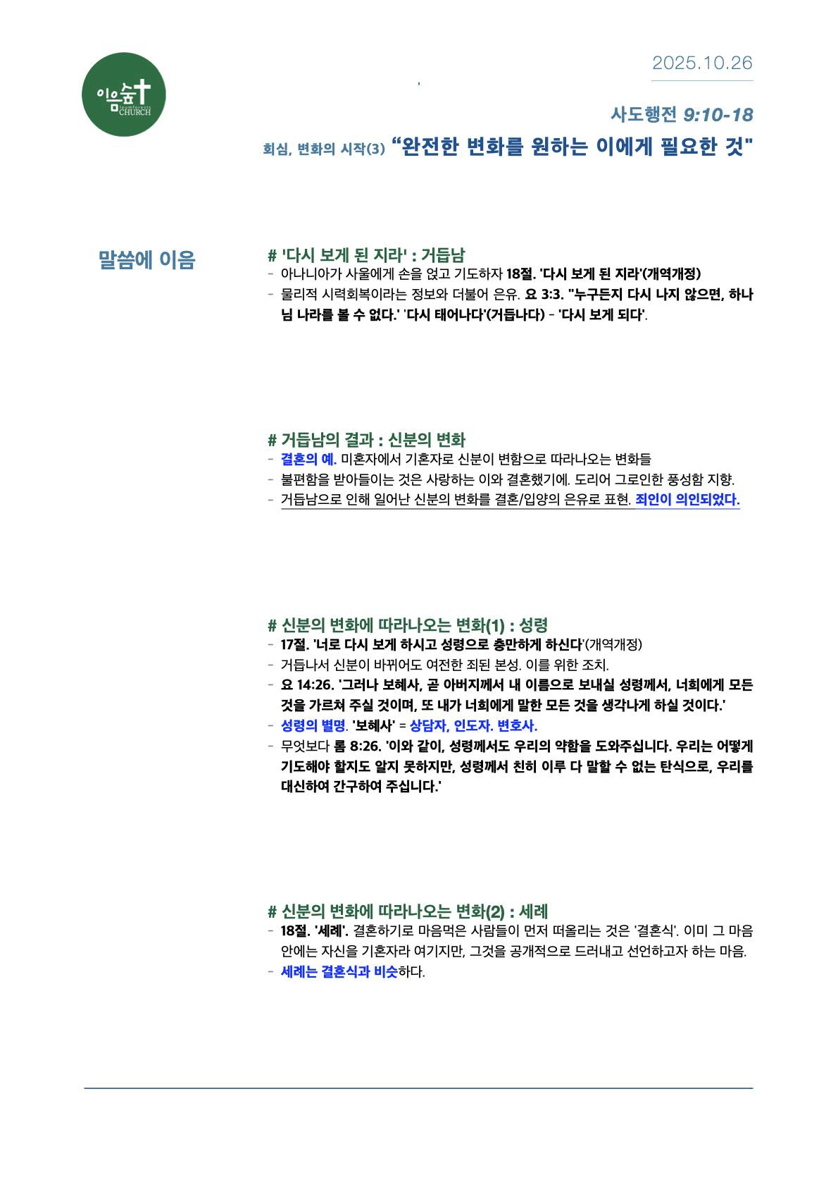 25.10.26 “완전한 변화를 원하는 이에게 필요한 것” [사도행전 9장]